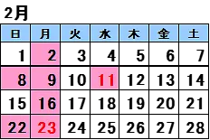 2月 2、8、9、11、16、22、23